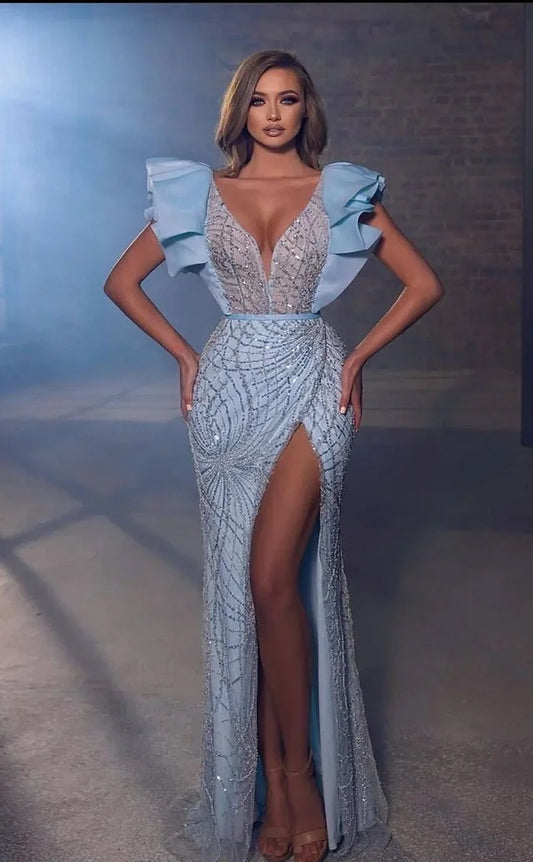 RP698-Gorgeous Sky Blue Mermaid V-Neck Sequins Beads Cap Sleeves Long Prom Evening Dresses Formal Party Gowns With Slit