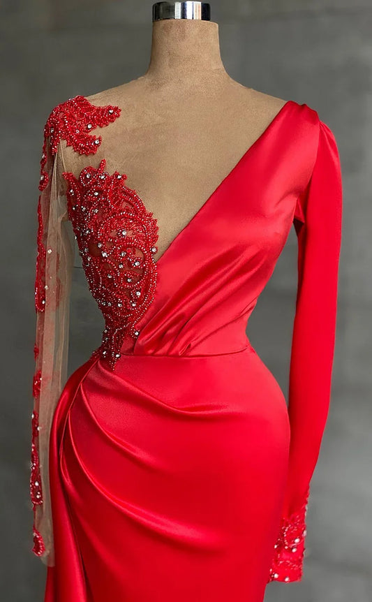 RP748-Elegant Red Mermaid V-Neck Beads Appliqued Long Sleeve Long Prom Evening Dresses Formal Party Gowns With Slit