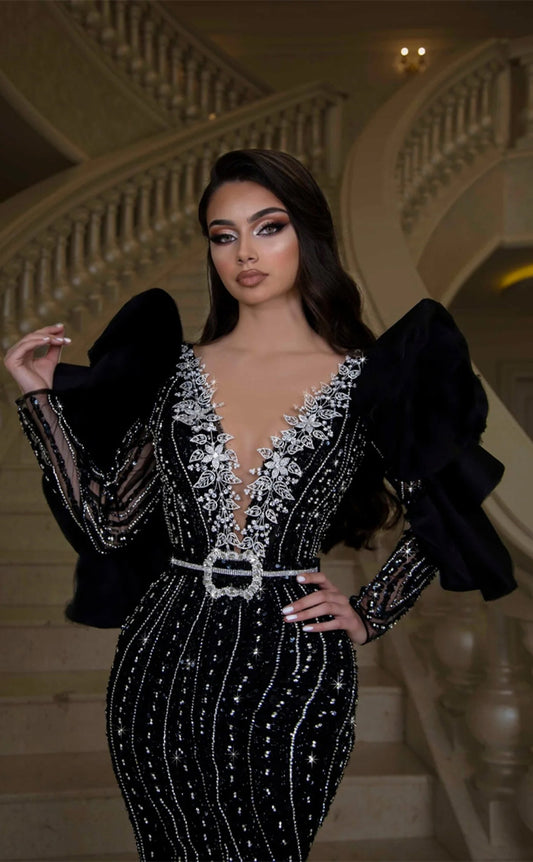 RP244-Black Trumpet V-Neck Beads Appliqued Long Sleeves Prom Evening Dresses Formal Party Gowns