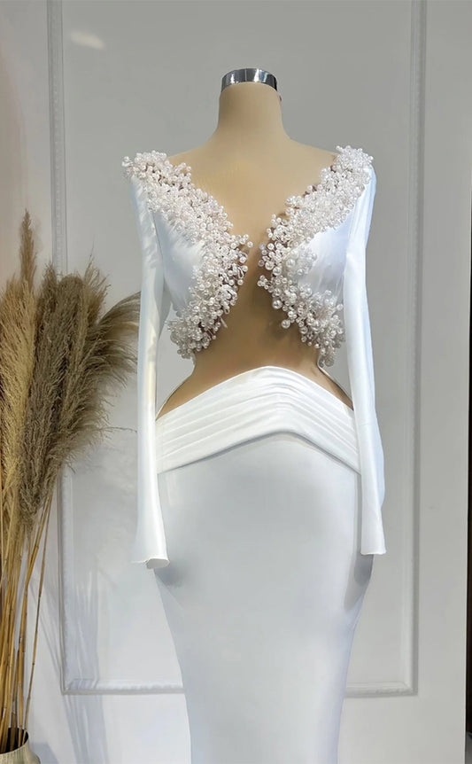 RP272-Classic Trumpet V-Neck Beads Pearls Long Sleeves Prom Evening Dresses Formal Party Gowns With Cut-out