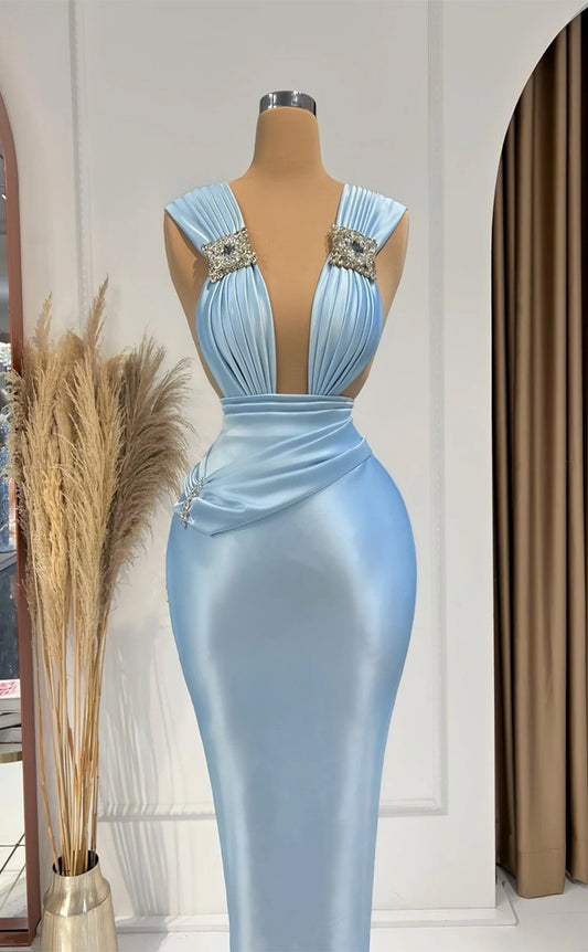 RP276-Gorgeous Sky Blue Trumpet V-Neck Beads Pleated Sleeveless Prom Evening Dresses Formal Party Gowns