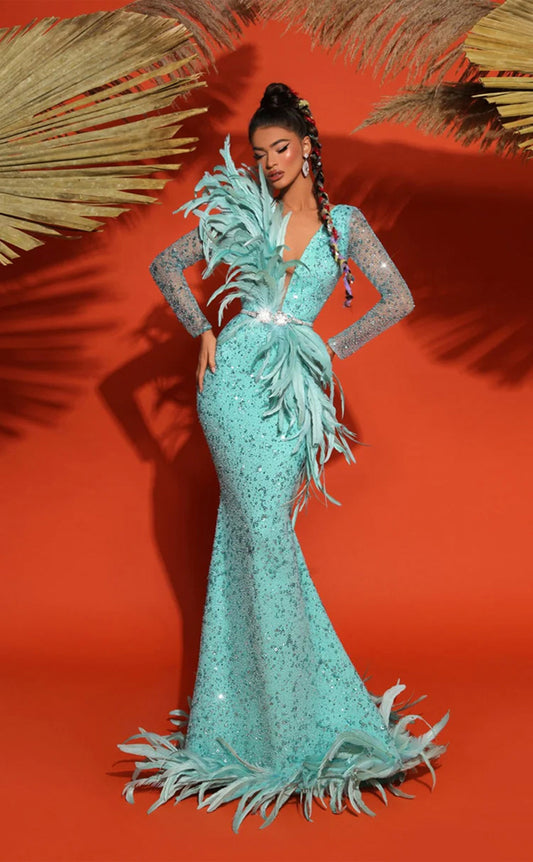 RP309-Luxury Green Mermaid V-Neck Beads Crystals Feathers Long Sleeves Prom Evening Dresses Formal Party Gowns With A Sash