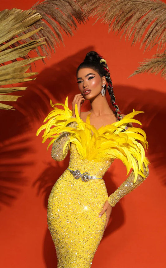 RP308-Luxury Yellow Mermaid V-Neck Beads Crystals Feathers Long Sleeves Prom Evening Dresses Formal Party Gowns With A Sash
