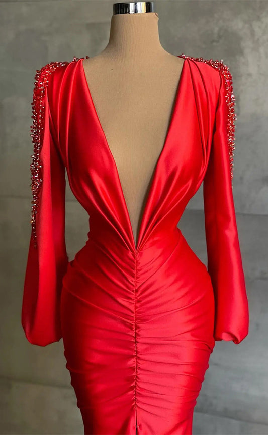 RP317-Elegant Red Mermaid V-Neck Beads Pleated Long Sleeves Prom Evening Dresses Formal Party Gowns With Slit