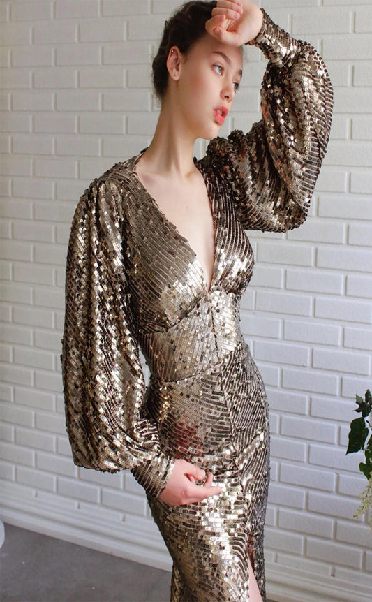 RP474-Elegant A-Line V-Neck Ruched Sequins Long Sleeves Long Prom Evening Dresses Formal Party Gowns With Side Slit