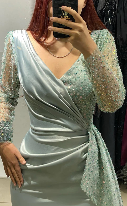 RP346-Elegant Mermaid V-Neck Beads Pleated Long Sleeves Prom Evening Dresses Formal Party Gowns