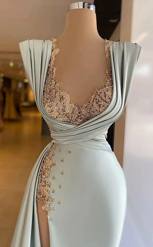 RP353-Gorgeous Mermaid V-Neck Pleated Appliqued Cap Sleeves Prom Evening Dresses Formal Party Gowns With Slit