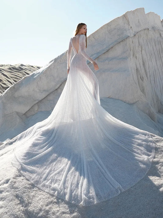 Simple & Sexy A-Line Wedding Dresses V-Neck Sequins Long Sleeves Tulle Court Train Bridal Gowns Custom Made