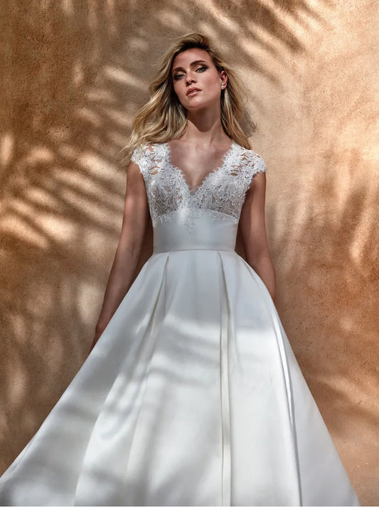 Charming & Elegant A-Line Wedding Dresses V-Neck Beads Appliqued Lace Sweep Train Bridal Gowns