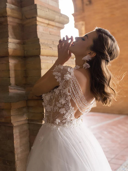 Simple & Elegant Ball Gown Boho Wedding Dresses V-Neck Applqued Tulle Court Train Bridal Gowns Custom Made