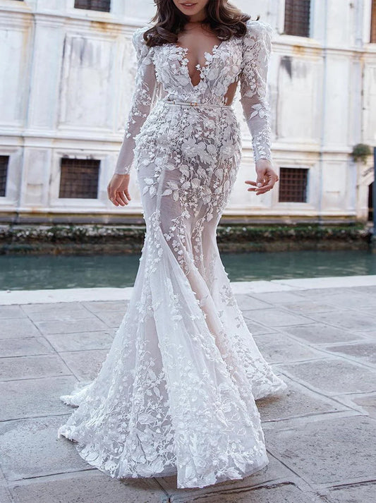 Elegant Mermaid Wedding Dresses V-Neck Appliqued Long Sleeves Tulle Sweep Train Bridal Gowns Custom Made