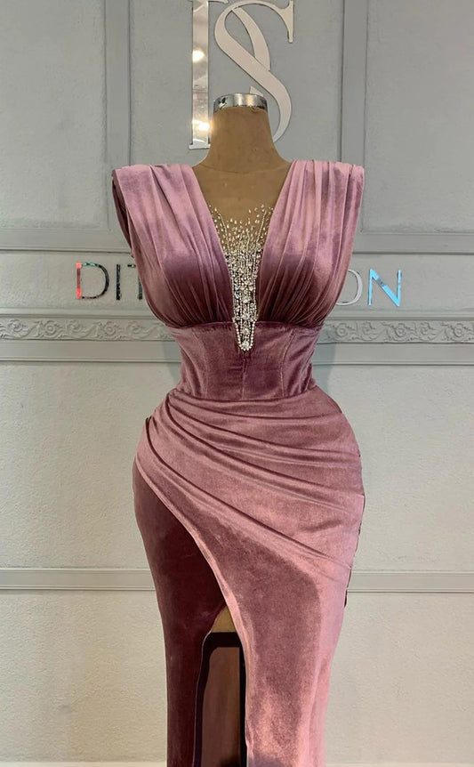 RP1928-Unique Purple Mermaid V-Neck Pleated Beaded Sleeveless Velvet Prom Evening Dresses Formal Party Gowns With Slit