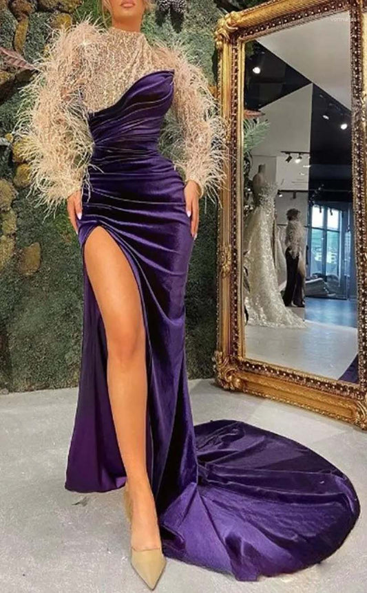 RP2029-Unique Peacock Mermaid High Neck Feather Pleated Long Sleeves Velvet Prom Evening Dresses Formal Party Gowns With Slit