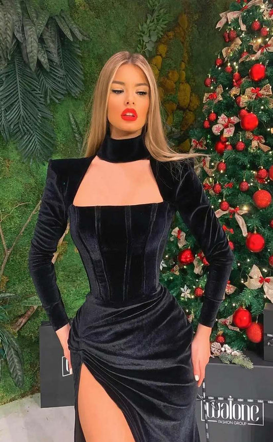 RP2040-Special Black Mermaid High Neck Pleated Long Sleeves Velvet Prom Evening Dresses Formal Party Gowns With Slit