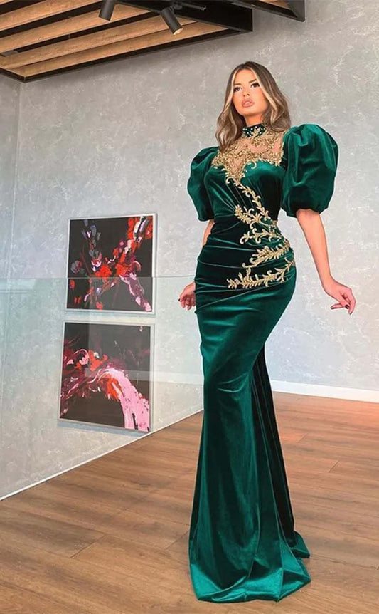 RP2041-Charming Green Mermaid High Neck Pleated Appliqued Half Sleeves Velvet Prom Evening Dresses Formal Party Gowns