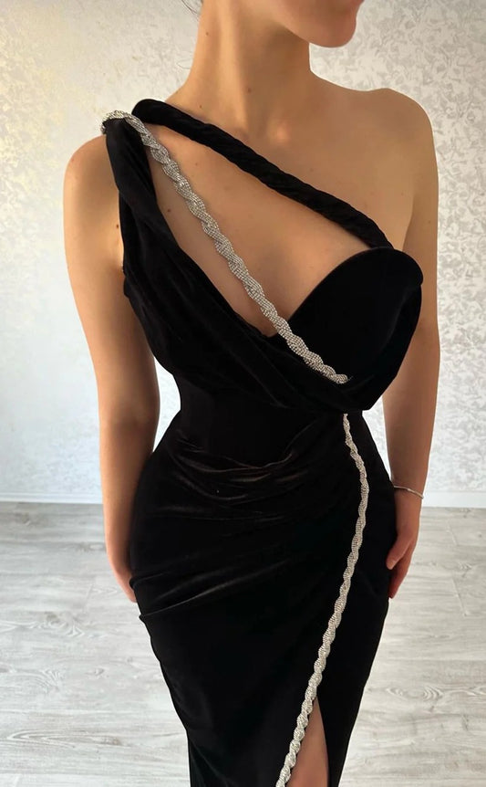 RP1210-Gorgeous Black Mermaid One Shoulder Beads Ruched Sleeveless Velvet Prom Evening Dresses Formal Party Gowns With Slit