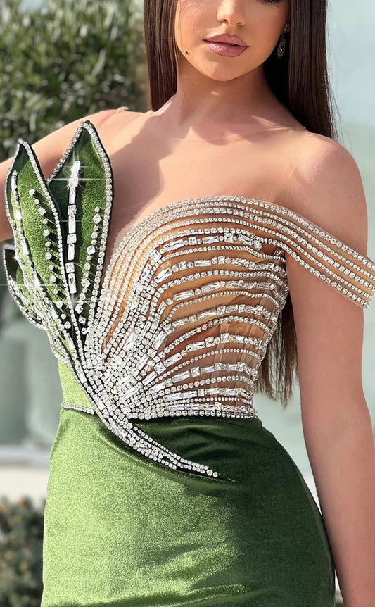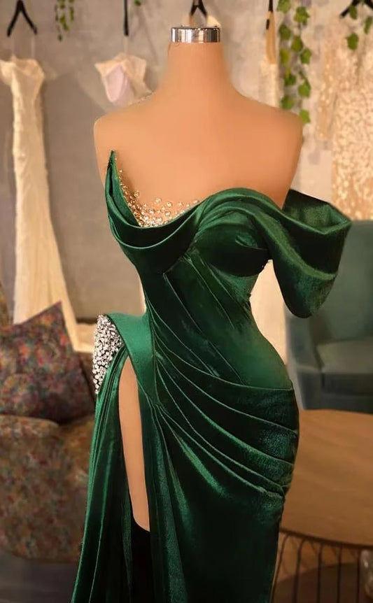 RP1120-Classic Green Mermaid One Shoulder Ruched Crystals Cap Sleeves Velvet Long Prom Evening Dresses Formal Party Gowns With Slit