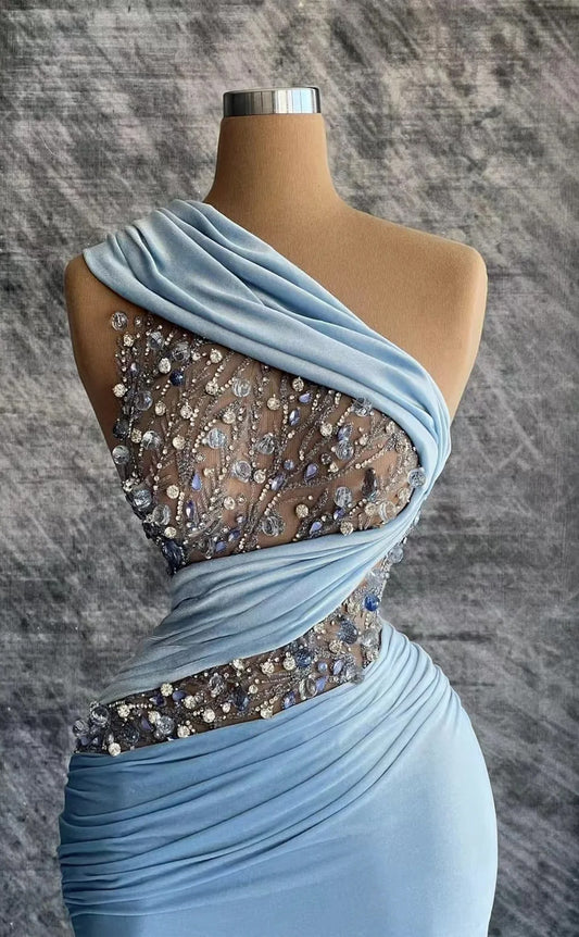 RP1168-Classic Sky Blue Mermaid One Shoulder Crystals Ruched Sleeveless Velvet Prom Evening Dresses Formal Party Gowns With Slit