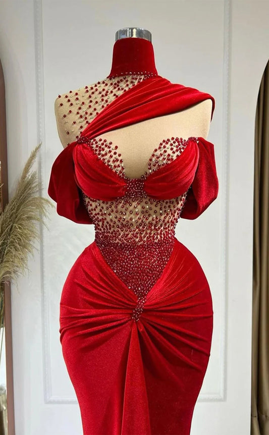 RP228-Modern Mermaid Halter Beads Crystals Velvet Long Prom Evening Dresses Formal Party Gowns