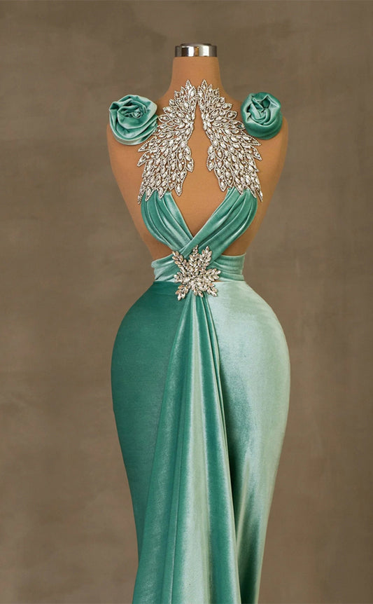 RP298-Elegant Mermaid High Neck Beads Crystals Sleeveless Velvet Prom Evening Dresses Formal Party Gowns With Handmade Flowers