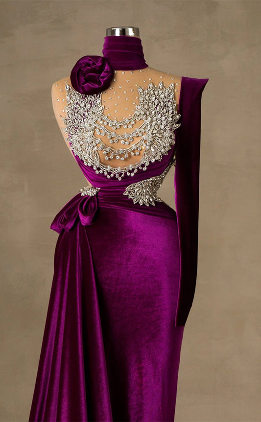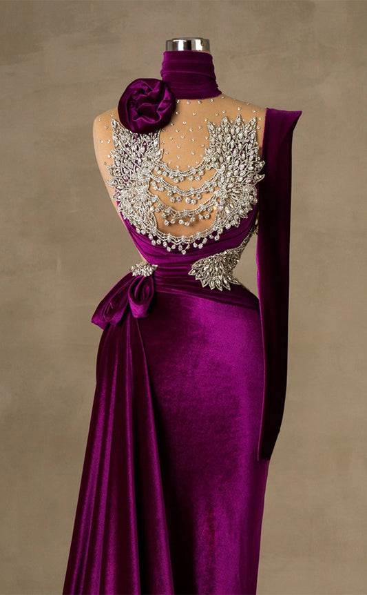 RP313-Elegant Purple Mermaid High Neck Beads Appliqued Sleeveless Velvet Prom Evening Dresses Formal Party Gowns With Flower