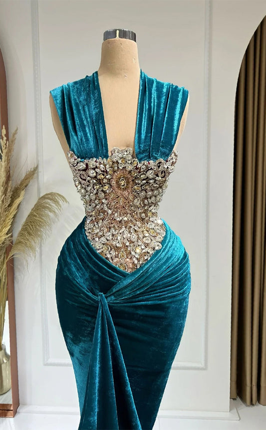 RP332-Peacock Blue Mermaid V-Neck Beaded Crystals Pleated Sleeveless Velvet Prom Evening Dresses Formal Party Gowns