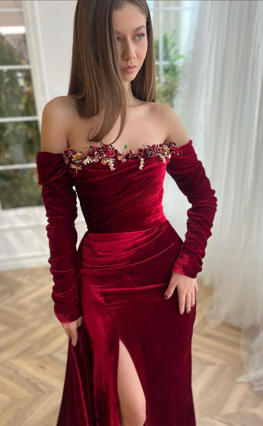 RP148-Burgundy Mermaid Strapless Long Sleeves Long Velvet Prom Evening Dresses Formal Party Gowns With Slit