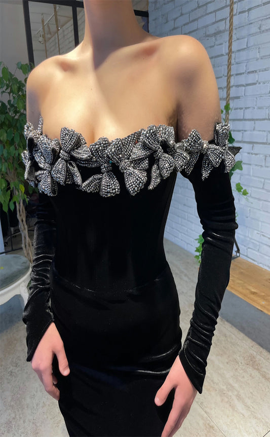 RP190-Black Trumpet Sweetheart Long Sleeves Bownkot Long Prom Evening Dresses Formal Party Gowns With Slit