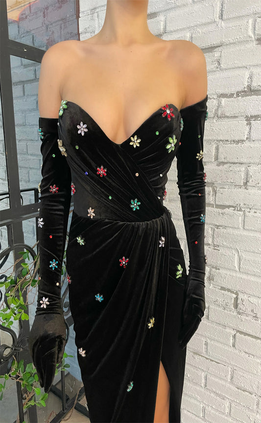 RP116-Special Black Mermaid Sweetheart Beaded High Side Slit Court Train Velvet Long Prom Dresses Formal Party Evening Gowns