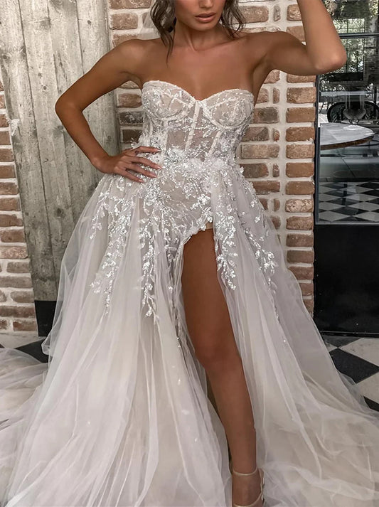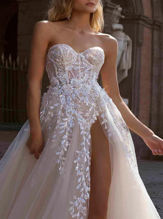 Modern A-Line Beach Wedding Dresses Sweetheart Appliqued Tulle Sweep Train Bridal Gowns With Slit