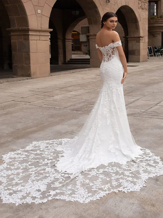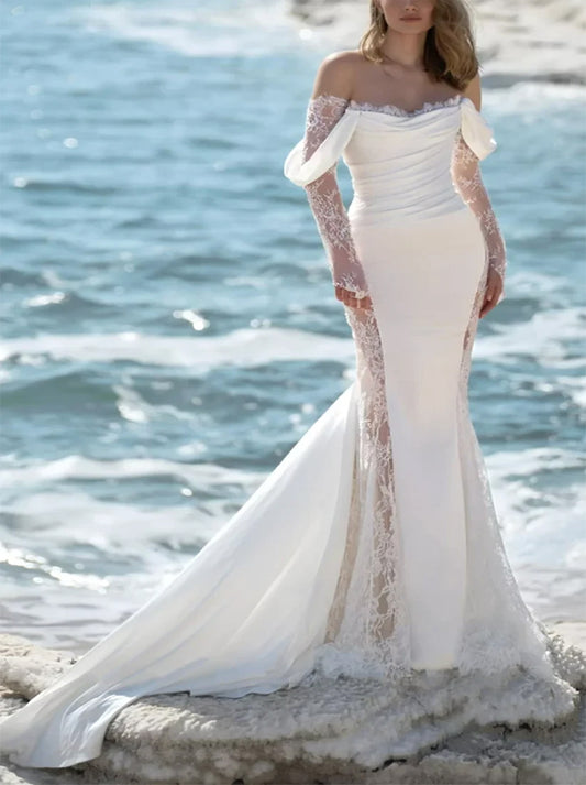 Sexy Mermaid Wedding Dresses Off The Shoulder Lace Satin Sweep Train Bridal Gowns Custom Made