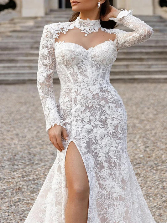 Luxurious Mermaid Wedding Dresses High Collar Appliqued Beads Tulle Sweep Train Bridal Gowns Custom Made