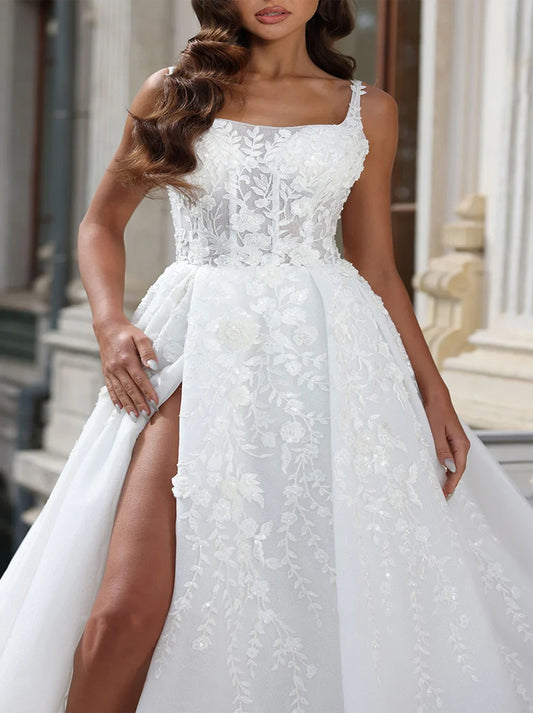Gorgeous A-Line Beach Wedding Dresses Spaghetti Appliqued Sequins Organza Sweep Sweep Train Bridal Gowns With Slit