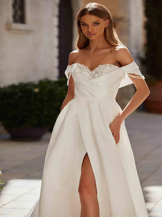Gorgeous A-Line Beach Wedding Dresses Off The Shoulder Beads Cap Sleevels Satin Sweep Train Bridal Gowns With Slit