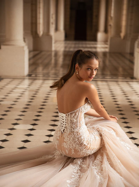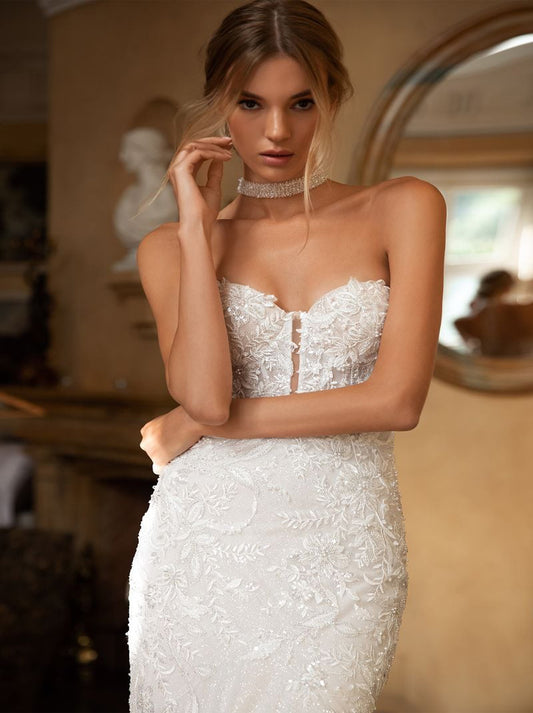 Sexy Mermaid Wedding Dresses Strapless Appliqued Beads Tulle Sweep Train Bridal Gowns Custom Made
