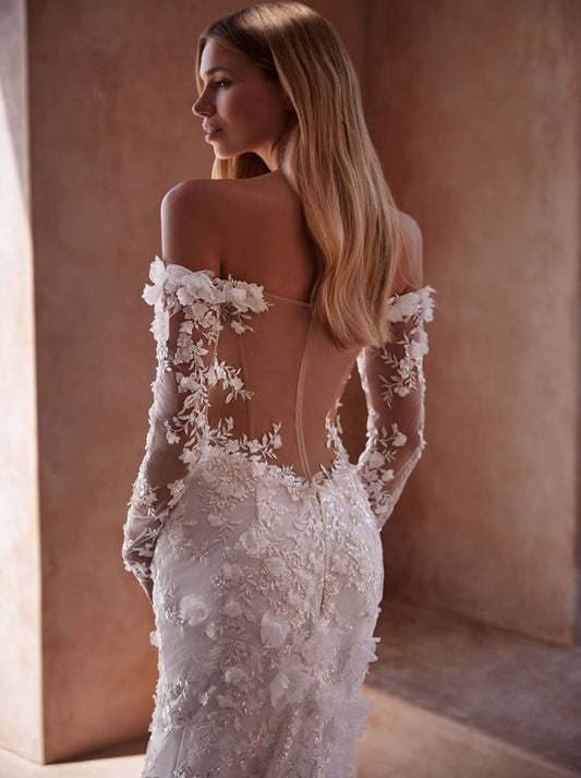 Luxurious Mermaid Wedding Dresses Off The Shoulder Appliqued Beads Long Sleeves Tulle Sweep Train Bridal Gowns