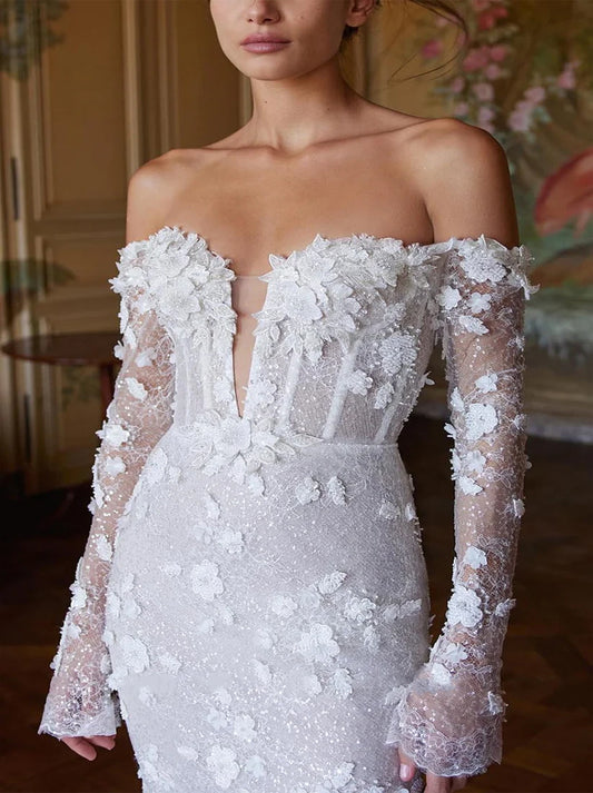 Elegant Mermaid Wedding Dresses V-Neck Appliqued Long Sleeves Tulle Sweep Train Bridal Gowns Custom Made