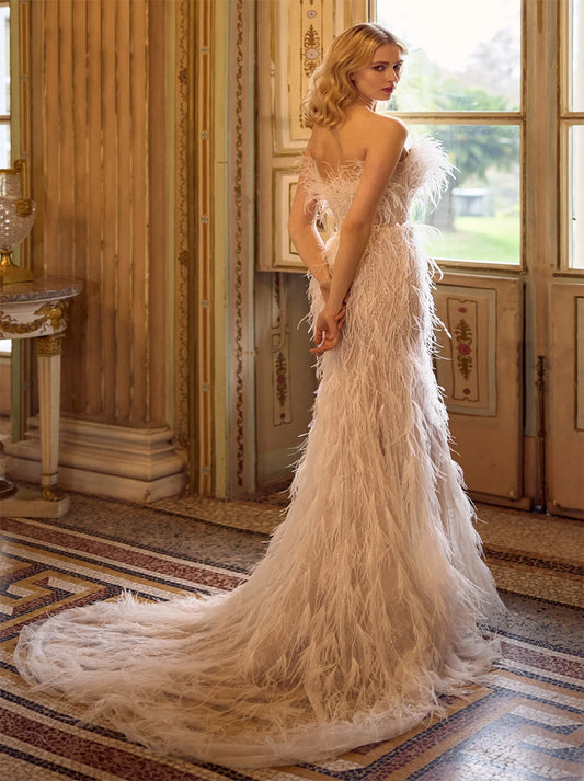 Luxurious & Charming Mermaid Wedding Dresses Sweetheart Feather Beads Sleeveless Tulle Sweep Train Bridal Gowns Custom Made