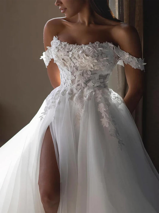 Gorgeous A-Line Beach Wedding Dresses Off The Shoulder Appliqued Cap Sleevels Tulle Sweep Train Bridal Gowns With Slit