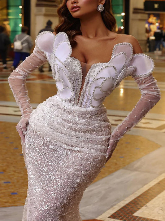 Sparkling Mermaid Wedding Dresses Strapless Sequins Ruffles Long Sleeves Sweep Train Bridal Gowns With Slit