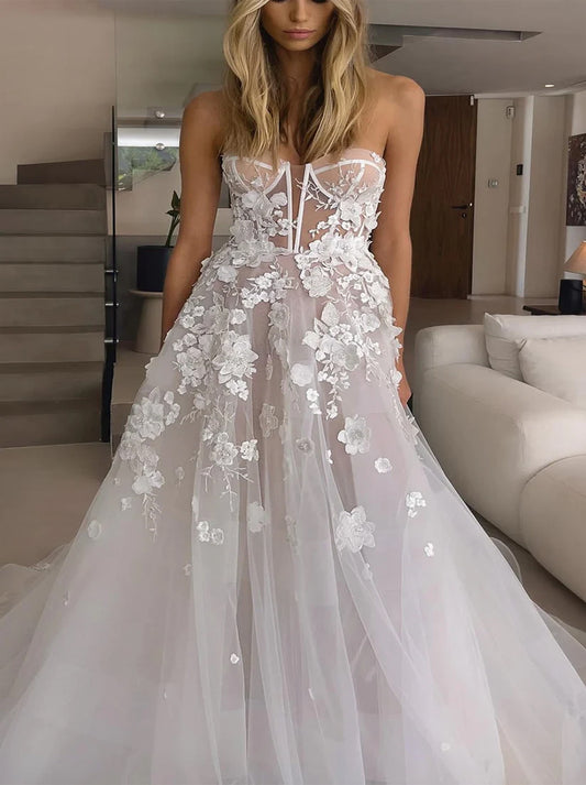 Gorgeous A-Line Beach Wedding Dresses Sweetheart Appliqued Sleeveless Tulle Sweep Train Bridal Gowns Custom Made