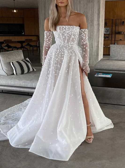 Modern A-Line Beach Wedding Dresses Strapless Appliqued Detachable Long Sleeves Tulle Sweep Train Bridal Gowns With Slit