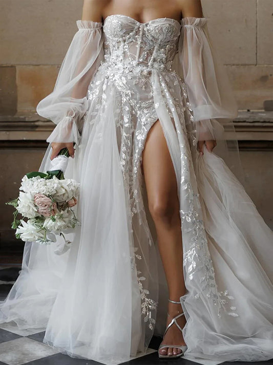 Modern A-Line Beach Wedding Dresses Sweetheart Appliqued Detachable Long Sleeves Tulle Sweep Train Bridal Gowns With Slit