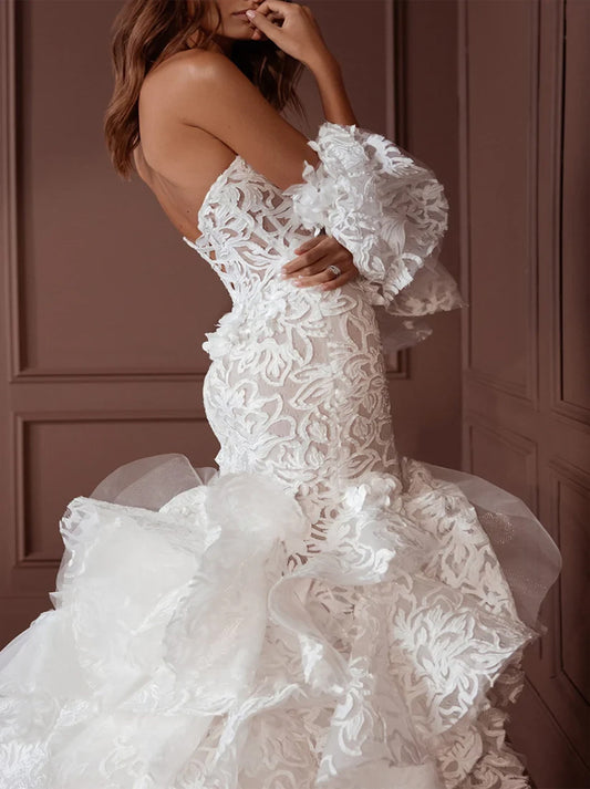Simple Mermaid Wedding Dresses Sweetheart Puffy Sleeves Lace Sweep Train Bridal Gowns Custom