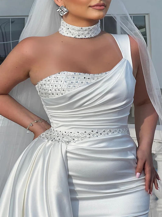 Simple Mermaid Wedding Dresses One Shoulder Pleated Beads Sweep Train Bridal Gowns Custom Made