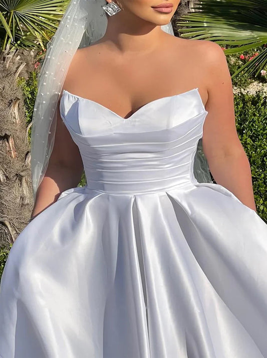 Simple A-Line Beach Wedding Dresses Sweetheart Pleated Satin Sweep Train Bridal Gowns