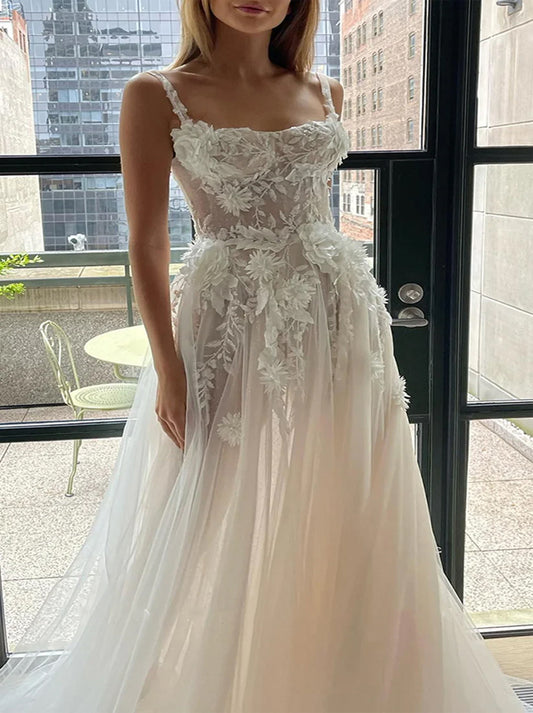 Gorgeous A-Line Beach Wedding Dresses Spaghetti Appliqued Tulle Sweep Sweep Train Bridal Gowns With Slit