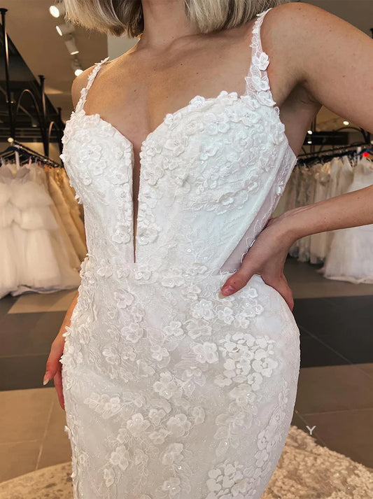Gorgeous Mermaid Wedding Dresses Spaghetti Appliqued Satin Court Train Bridal Gowns Custom Made