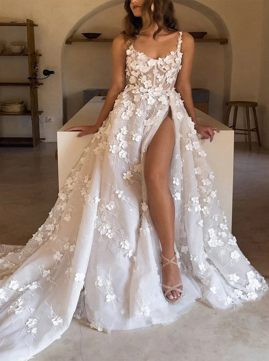 Gorgeous A-Line Beach Wedding Dresses Spaghetti Appliqued Tulle Sweep Train Bridal Gowns With Slit