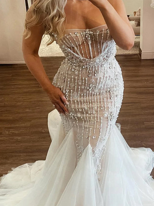 Luxurious Mermaid Wedding Dresses Sweetheart Beads Pearls Tulle Sweep Train Bridal Gowns Custom Made